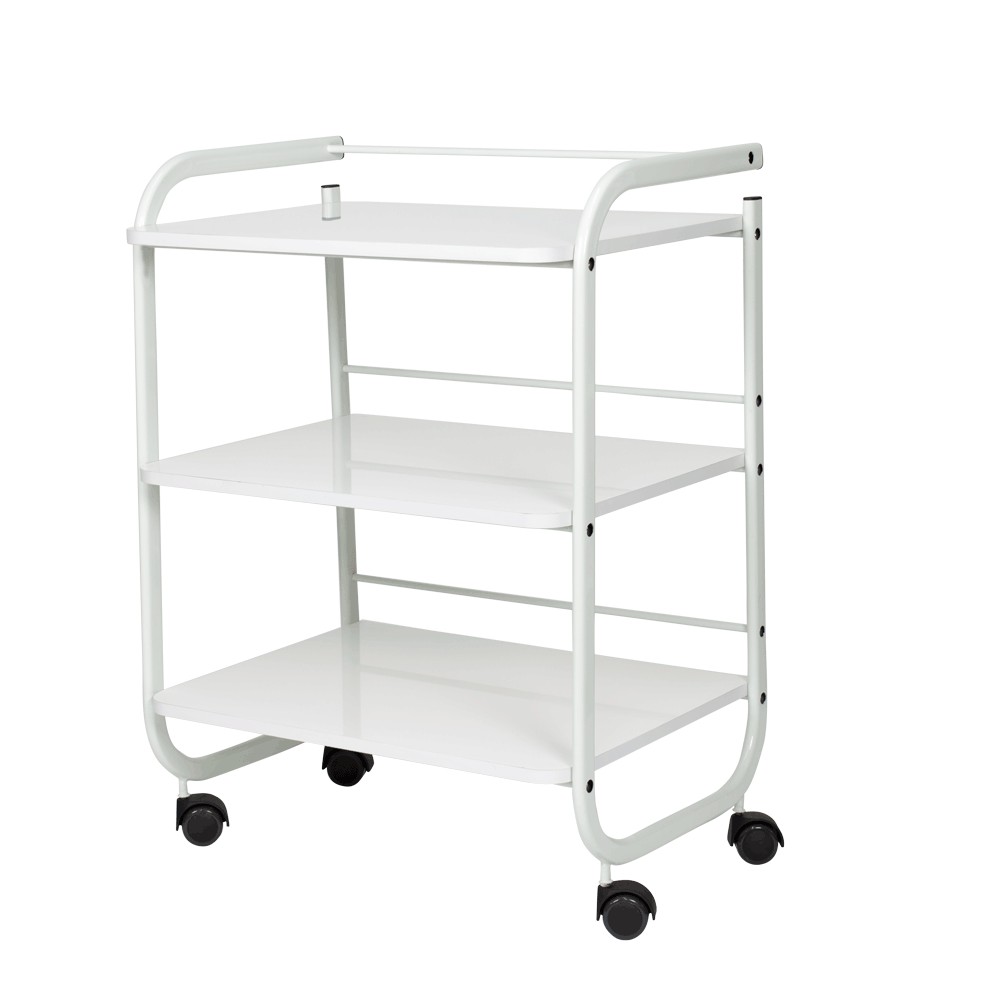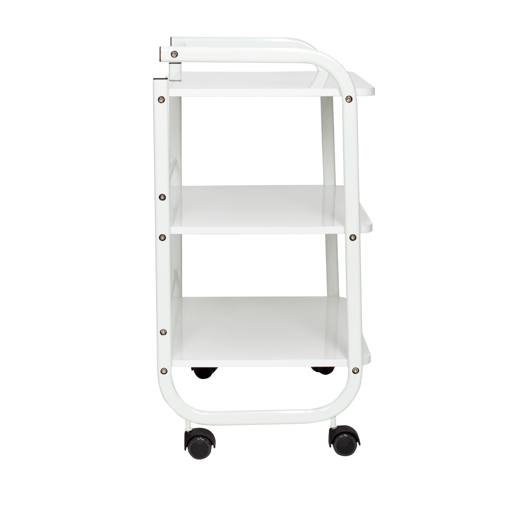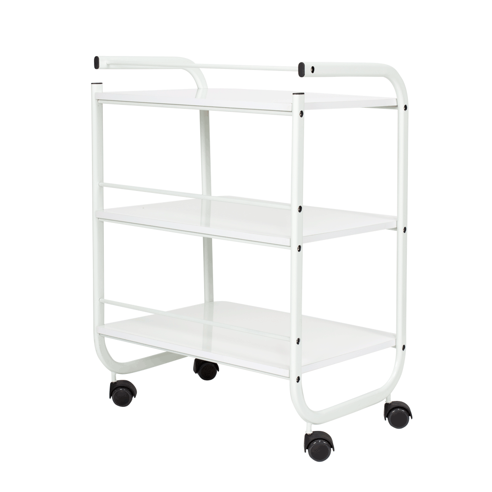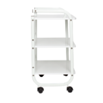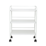 Carrito de estética con ruedas, de estructura metálica de color blanco y diseño minimalista, con 3 estantes de madera aglomerada y recubierta de melanina blanca y cantoneada. Es imprescindible para alojar aparatos de estética o almacenar accesorios de centros de belleza. Total movilidad gracias a sus 4 ruedas.