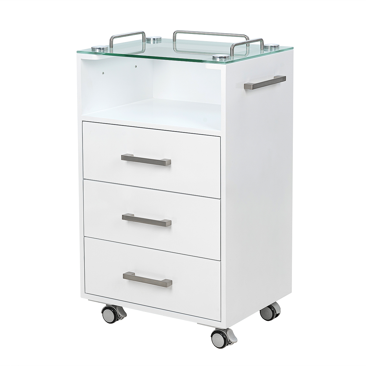 Además, dispone de un estante interno diseñado para guardar equipos de aparatología, y un estante frontal de cristal grueso, resistente a líquidos químicos, lo que facilita una limpieza profunda y garantiza una esterilización segura. El estante superior, con bordes de seguridad, evita la caída de accesorios o herramientas durante su uso.