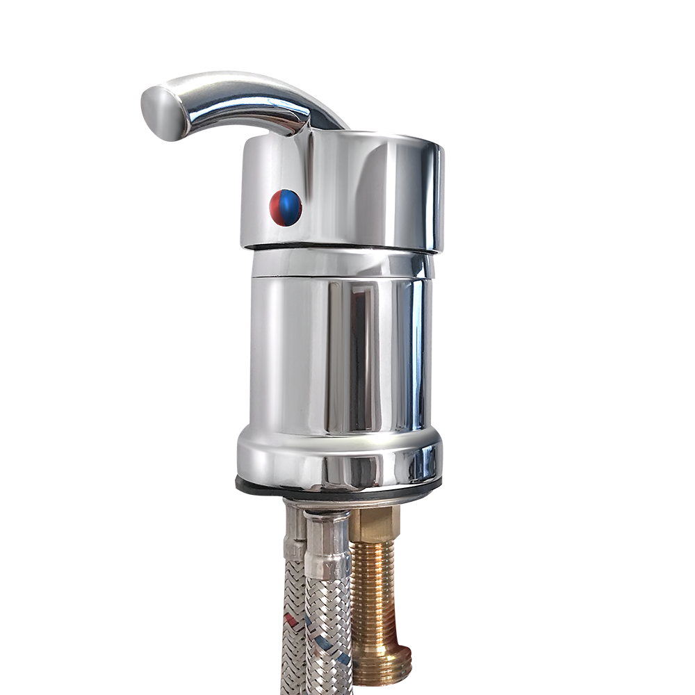 Monomando Fuente en acero cromado. El monomando consta del dos latiguillos (longuitud 37 cm) para agua caliente y fria junto.